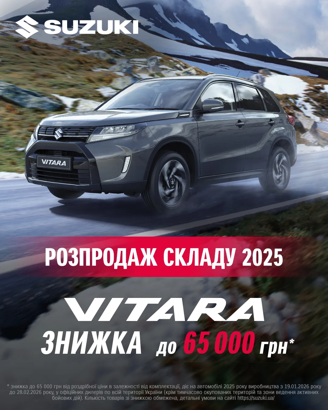 *знижка до 65 000 грн від роздрібної ціни в залежності від комплектації, діє з 19.01.2026 до 28.02.2026 року на автомобілі 2025 року виробництва, у офіційних дилерів по всій території України (крім тимчасово окупованих територій та зони ведення активних бойових дій). Кількість товарів зі знижкою обмежена, детальні умови на сайті https://suzuki.com.ua/.